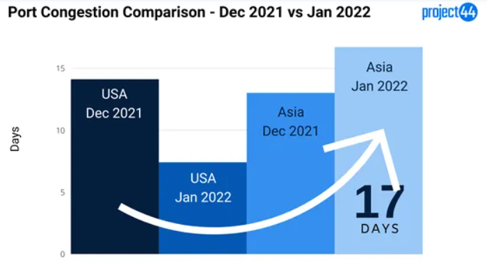 New data analyzed and released by project44 shows vessels waiting to berth in Asia recorded an average increase from 13 days in December to 16.7 days in January. Hong Kong, which has seen an increase in COVID cases, tops the list with the largest increase from 17.5 days to 22.5 days.